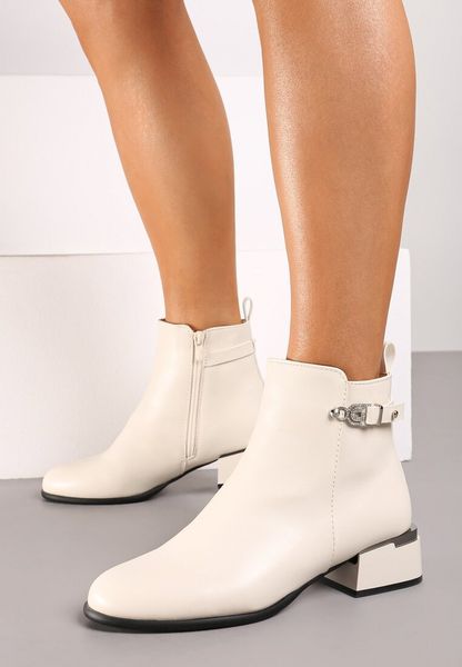 Beżowe Botki na Obcasie w Stylu Sztybletów Ozdobione Metalicznymi Aplikacjami Arhella