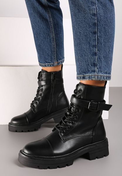 Botki Nantinas to kwintesencja militarnego szyku. Stylowe, wiązane botki na grubej podeszwie, gwarantują stabilność. Pasek z klamrą dla szczypty elegancji. Idealne do rockowej stylizacji z jeansami i skórzaną kurtką, ale też odważnym akcentem do zwiewnej sukienki, kiedy pragniesz złamać formalne konwenanse.