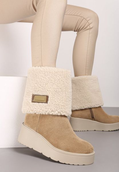 Beżowe Botki na Koturnie Ozdobione Barankiem i Wywiniętą Cholewką Irissinae