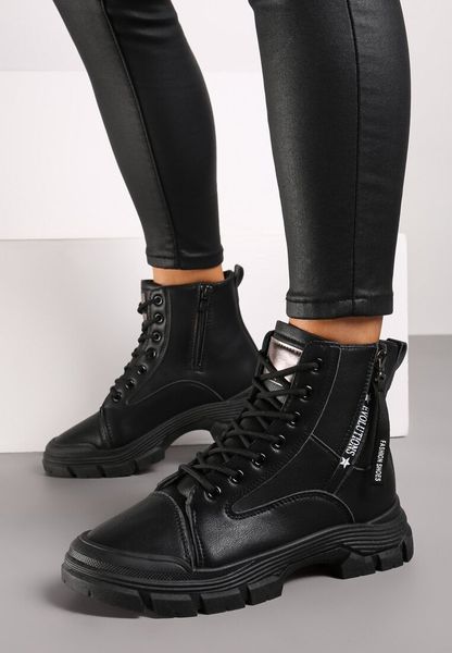 Rozmiarówka: Typowa, Tęgość stopy: Wąski, Rodzaj obcasa: Płaski, Ocieplenie: Ocieplony, Wkładka/wyściółka: Sztuczne futro, Materiał: Imitacja skóry, Nosek buta: Okrągły, Zapięcie: Sznurowanie, Sezon: Zimowy, Kod produktu: 349516, Kolor: Czarny