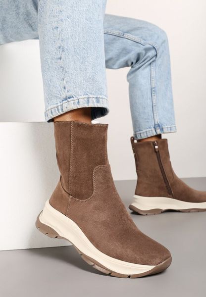Ciemnobeżowe Botki z Imitacji Zamszu na Grubej Podeszwie w Streetwearowym Stylu Reanornna