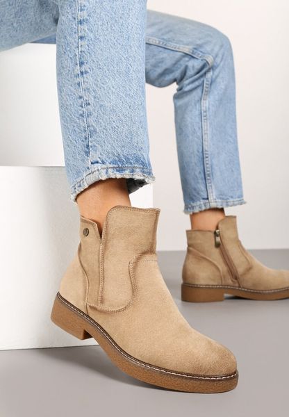 Beżowe Płaskie Botki Ozdobione Aplikacją i Przeszyciami Hariella