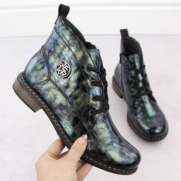 Botki damskie lakierowane kroko zielone Rieker 71205-90