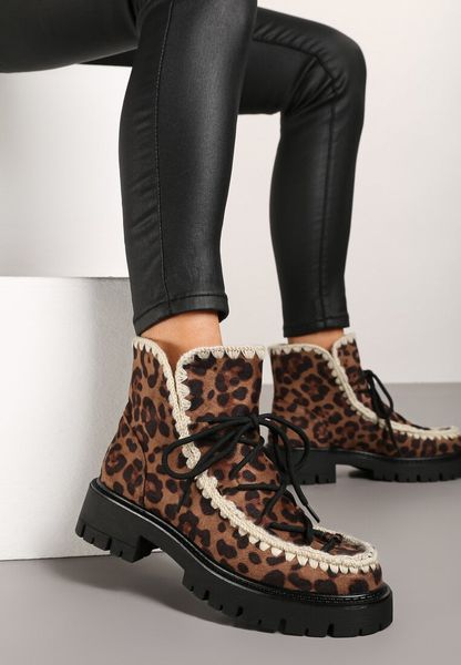 Brązowe Botki z Ekozamszu w Panterkę z Dodatkowym Kompletem Sznurówek Zdobione Haftem Noledi
