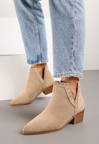Ciemnobeżowe Ażurowe Botki Vices na Obcasie Ozdobione Wycięciem i Nitami Lilfedi