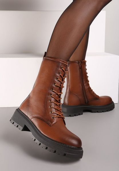 Jasnobrązowe Botki na Płaskiej Podeszwie Ozdobione Wiązaniem Laolin