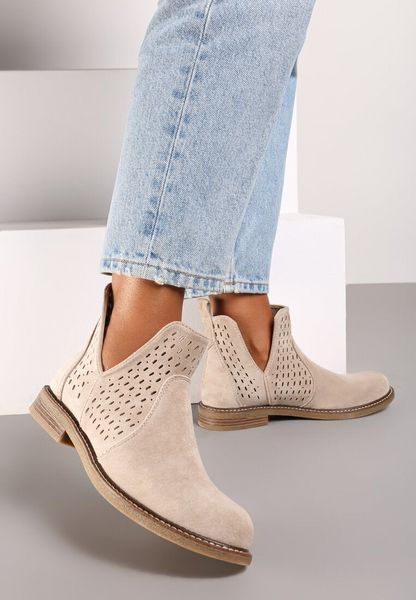 Beżowe Botki Sztyblety z Ażurowymi Wycięciami i Skórzaną Wkładką Bralithia
