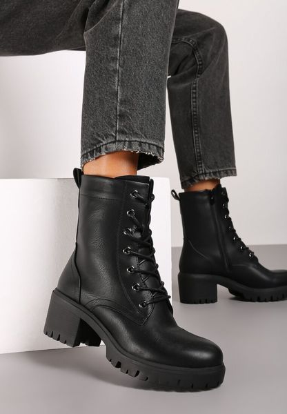 Czarne Botki na Słupku w Stylu Workerów z Ekoskóry Wykończone Wiązaniem Timovia