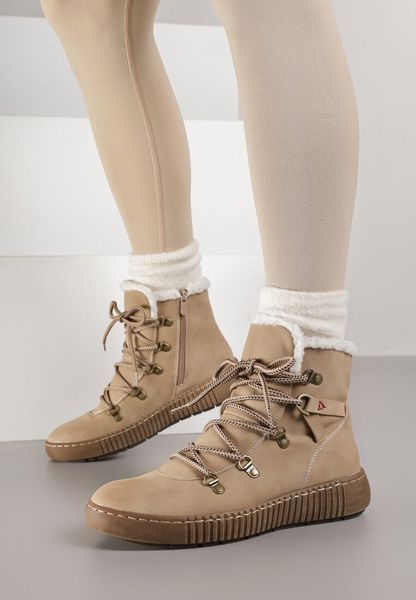 Beżowe Botki Traperki z Ozdobnym Sznurowaniem i Tłoczoną Podeszwą Fasitta