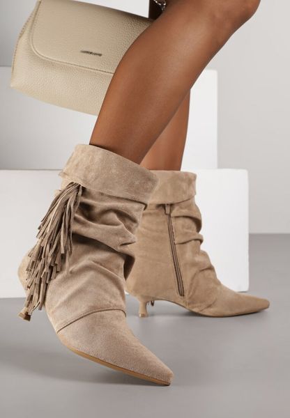 Ciemnobeżowe Wywinięte Botki na Kaczuszce Zdobione Marszczeniem i Frędzlami Gevea