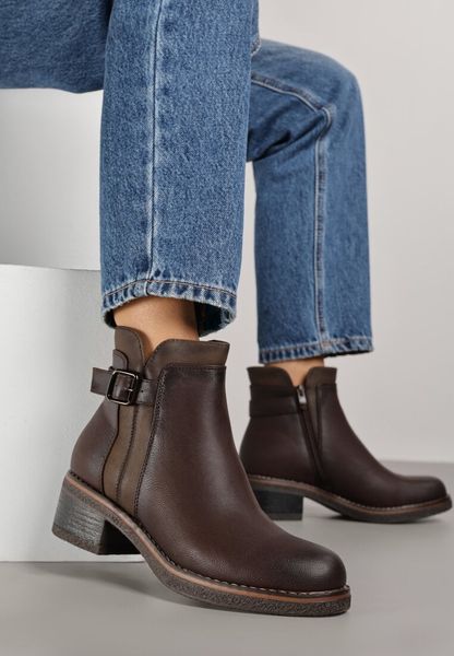 Ciemnobrązowe Lekko Ocieplane Botki na Słupku Wykończone Paskiem z Klamrą Rilara