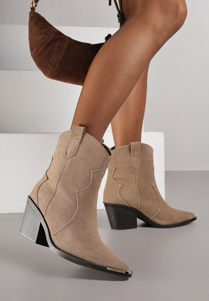 Ciemnobeżowe Skórzane Botki Kowbojki z Metaliczną Aplikacją na Nosku Saneara