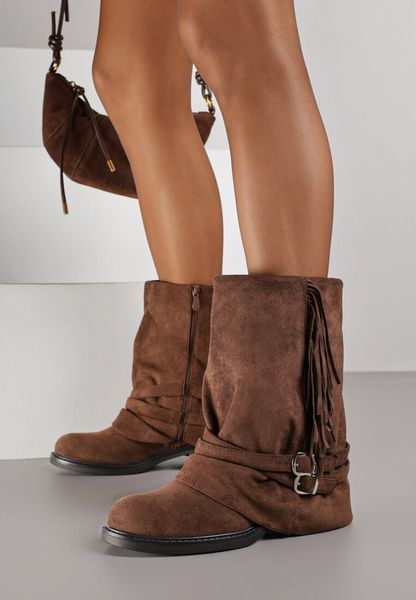 Brązowe Botki z Imitacji Zamszu z Wywiniętą Cholewką Frędzlami i Klamrami Ramessa