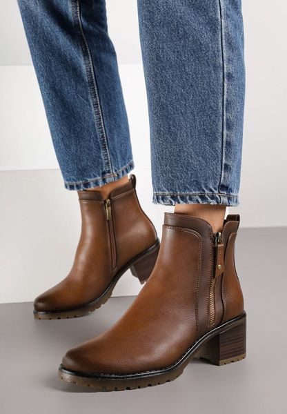 Brązowe Klasyczne Botki na Słupku z Ozdobnym Suwakiem Fesonea