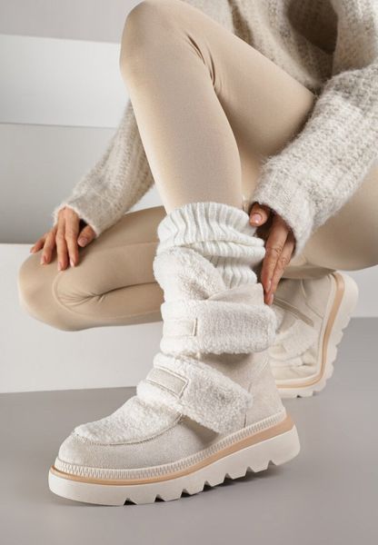 Beżowe Botki Typu Śniegowce na Platformie z Dwoma Ozdobnymi Rzepami Edarlia
