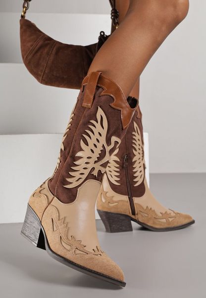 Brązowe Botki Kowbojki na Stożku z Tłoczoną Cholewką Badilora