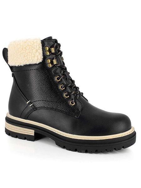 – zapięcie: sznurowanie z bocznym suwakiem- praktyczna szlufka ułatwiająca zakładanie- noski: zaokrąglone- noski i zapiętki: wzmocnione- detale: obszycie ze sztucznego futerka- forma obcasa: blokowy- podeszwa: antypoślizgowa
