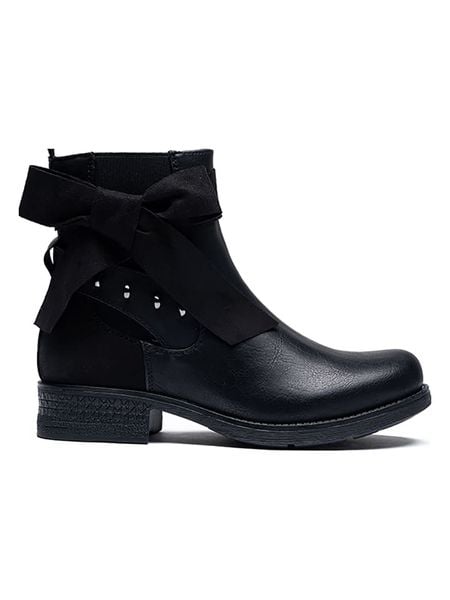 – zapięcie: suwak- stretchowe wstawki dla optymalnego komfortu- noski: zaokrąglone- noski i zapiętki: wzmocnione- detale: ozdobna kokarda- praktyczna szlufka ułatwiająca zakładanie- forma obcasa: blokowy- podeszwa: lekko profilowana