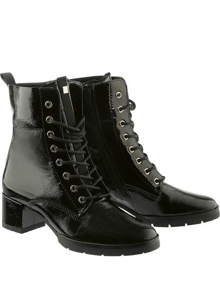 – zapięcie: sznurowanie z bocznym suwakiem- praktyczna szlufka ułatwiająca zakładanie- noski: zaokrąglone- noski i zapiętki: wzmocnione- skórzana wkładka: tak- forma obcasa: blokowy- podeszwa: lekko profilowana