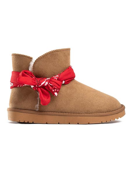 – wodoodporny materiał wierzchni o wyglądzie skóry welurowej („Microsuede”)- zapięcie: bez- noski: zaokrąglone- detale: ozdobne i formujące szwy, ozdobna kokarda- wyściółka: ciepła- podeszwa: antypoślizgowa