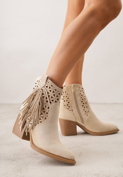 Beżowe Botki Kowbojki na Stożkowym Obcasie z Ażurowym Wzorem i Eathetina