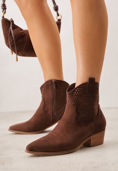 Brązowe Ażurowe Botki Vices w Stylu Kowbojek na Obcasie Norfedi