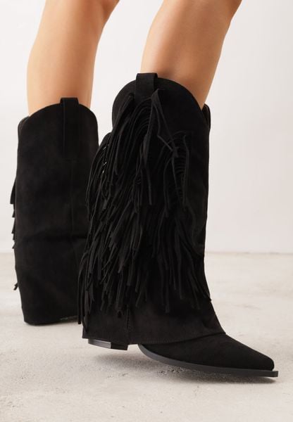 Czarne Botki Typu Kowbojki na Obcasie z Wywiniętą Cholewką i Frędzlami Uemiris