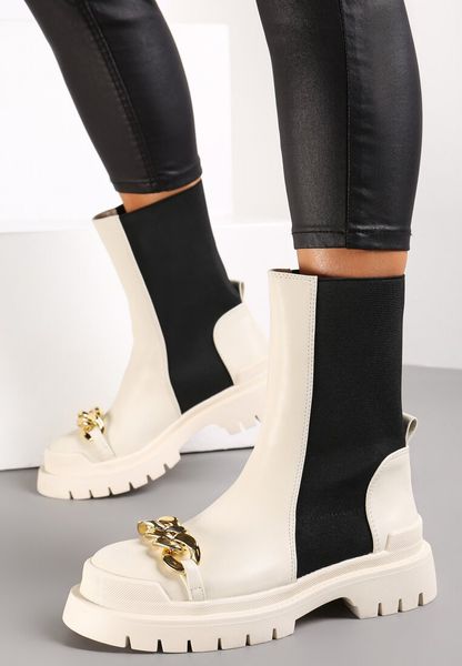 Botki Lyvarge na grubym obcasie i grubej podeszwie z bieżnikiem. Nosek okrągły. Wsuwane, z cholewką sięgającą do połowy łydki. Przy pięcie mała pętelka. W tylnej części wstawka z szerokiej gumy w dopasowanym kolorze. Przy nosku szeroki łańcuch w złotym kolorze. Wąskie, najlepiej leżą na smukłej stopie. Nieocieplane, wykonane z ekoskóry. Doskonałe do spódnic i sukienek […]