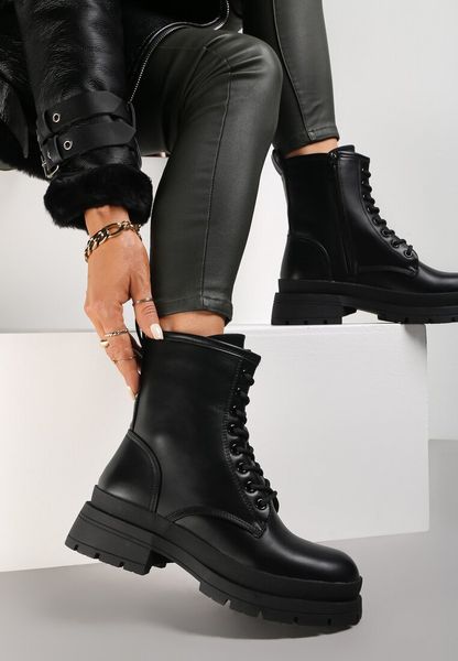 Botki Naesime na płaskim obcasie i grubej podeszwie. Pod spodem stabilizujący bieżnik zwiększający przyczepność buta do nawierzchni. Zasuwane, sięgające za kostkę. Z przodu wiązane na okrągłe sznurówki. Wykonane z ekoskóry urozmaiconej przeszyciami. Lekko ocieplane kocem obuwniczym. Łącz je ze spodniami skinny albo slim fit.