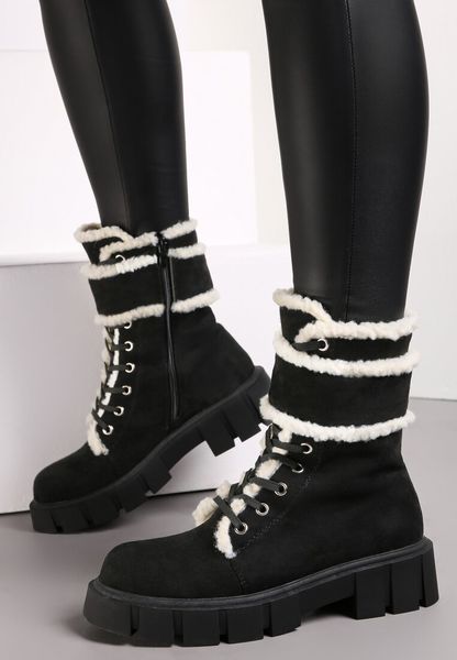 Czarne Botki Workery na Grubej Podeszwie z Futerkiem Valiro
