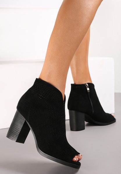 Czarne Botki Peep Toe na Słupku Zdobione Drobnymi Wycięciami Sallely