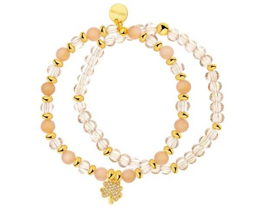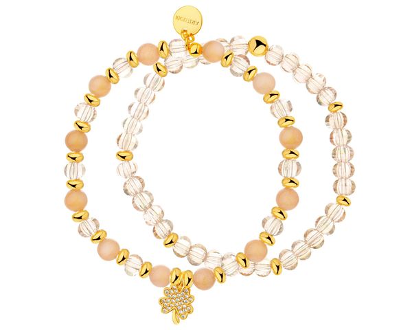 Bransoletka z mosiądzu pozłacana z kamieniami księżycowymi, szklanymi detalami i cyrkoniami – koniczyna – AR538-7882. Mosiądz pozłacany