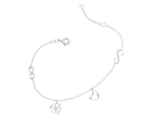 Bransoletka z białego złota z diamentami – serce, nieskończoność, koniczyna – 0,01 ct – próba 585