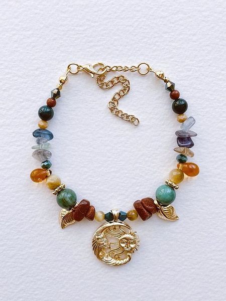– materiał: metal- powłoka: złoto- kształt zawieszki: medalion- rodzaj kamienia: kryształ Swarovski, perła, fluoryt, tygrysie oko- kolor kamienia: wielokolorowyWskazówka: Zdjęcie produktu w powiększeniu.
