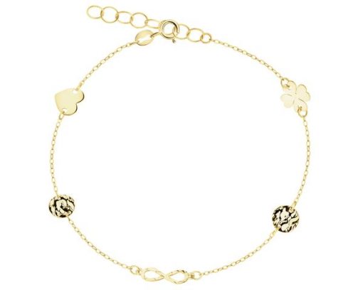 Złota bransoletka – serce, koniczyna, koła, nieskończoność – AP543-6150. Żółte złoto