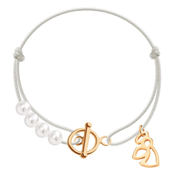 Bransoletka z aniołkiem o wielkości 1,7 cm i z białymi mini perłami na perłowym, cienkim sznurku. Użyte perły są naturalne, słodkowodne, charakteryzują się nieregularnym kształtem i niepowtarzalnością.