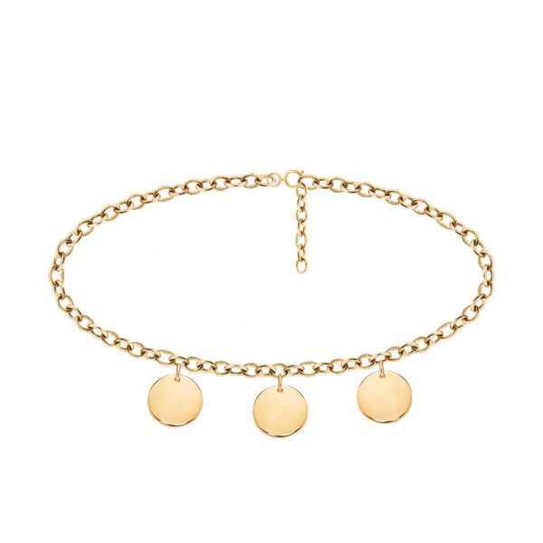 Bransoletka na kostkę z trzema zawieszkami medalikami, które są symbolami harmonii i talizmanami pozytywnych emocji. Wielkość zawieszek: 1 cmZ tyłu elementu znajduje się logo Lilou.Osobisty grawerunek uczyni Twoją biżuterię niepowtarzalną. Medaliki i łańcuszek wykonane są z mosiądzu pokrytego 18-karatowym złotem.Długość łańcuszka: 25 cm