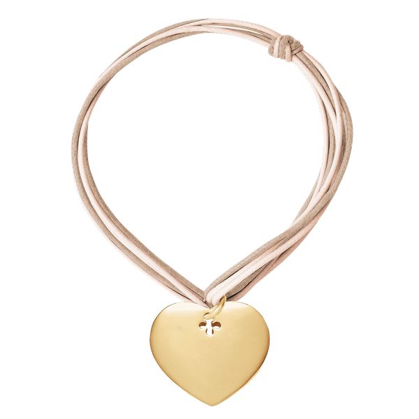 Bransoletka z pozłacanym sercem o wielkości 2 cm na dwóch podwójnych sznurkach w kolorach pudroworóżowym i beżowym. Osobisty grawerunek doda wyjątkowości i pomoże wyrazić uczucia.
