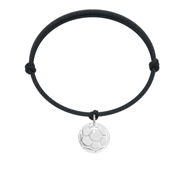 Bransoletka z posrebrzaną zawieszką w kształcie piłki nożnej na grubym czarnym sznurku