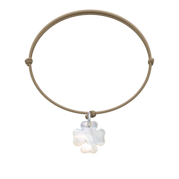 Bransoletka z koniczyną z masy perłowej o wielkości 1,5 cm na cienkim sznurku w kolorze jasnego cappuccino. Osobisty grawerunek doda wyjątkowości i pomoże wyrazić uczucia. Koniczyna jest symbolem szczęścia i pomyślności. Zawieszka została wykonana z masy perłowej dlatego jej faktura może odbiegać od prezentowanej na zdjęciu. Kółeczko ze srebra próby 925.