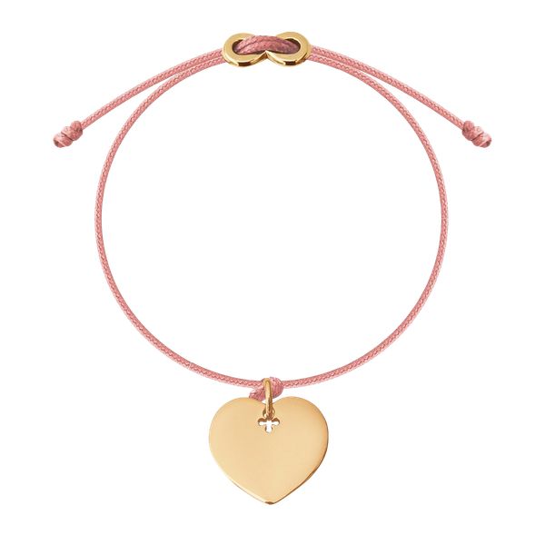 Bransoletka z pozłacanym sercem o wielkości 2 cm i zapięciem Infinity o wielkości 1,3 cm na cienkim różowym sznurku. Osobisty grawerunek doda wyjątkowości i pomoże wyrazić uczucia. Zawieszka i zapięcie pozłacane 18-karatowym złotem.