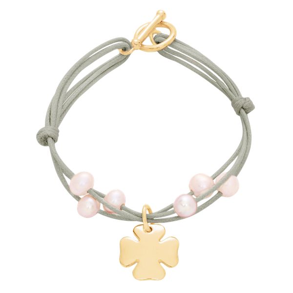 Bransoletka z pozłacanym zapięciem, pozłacaną koniczyną o wielkości 1,5 cm i 6 małymi różowymi perłami na cienkim, potrójnym, jasnoszarym sznurku. Osobisty grawerunek doda wyjątkowości i pomoże wyrazić uczucia. Koniczyna jest symbolem szczęścia i pomyślności. Zapięcie i zawieszka pozłacane 18-karatowym złotem. Użyte perły są naturalne, słodkowodne, charakteryzują się nieregularnym kształtem i niepowtarzalnością.