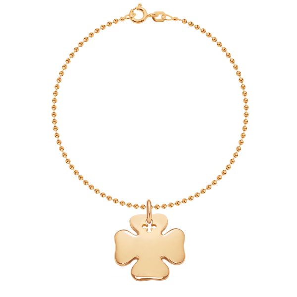 Bransoletka z pozłacaną koniczyną o wielkości 2 cm na łańcuszku Kulki. Osobisty grawerunek doda wyjątkowości i pomoże wyrazić uczucia. Koniczyna jest symbolem szczęścia i pomyślności. Zawieszka pozłacana 18-karatowym złotem.