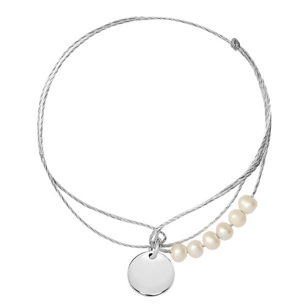 Bransoletka z posrebrzanym medalikiem o wielkości 1 cm i 6 mini perłami w kolorze białym na cienkim srebrnym sznurku premium. Osobisty grawerunek doda wyjątkowości i pomoże wyrazić uczucia. Medalik wykonany jest ze stali szlachetnej pokrytej srebrem próby 925. Użyte perły są naturalne, słodkowodne, charakteryzują się nieregularnym kształtem i niepowtarzalnością.
