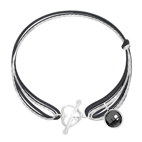 Bransoletka z posrebrzaną zawieszką z czarnym szkłem kryształowym o wielkości 1 cm i posrebrzanym zapięciem w kształcie serca na cienkim bawełnianym czarnym sznurku, srebrnym grubym sznurku premium i czarnym grubym sznurku premium. Waga zapięcia: 1,8 gram. Każdy z kolorów szkła zawiera w sobie symbolikę najpiękniejszych emocji ukrytych w talizmanie.Czarny to siła.