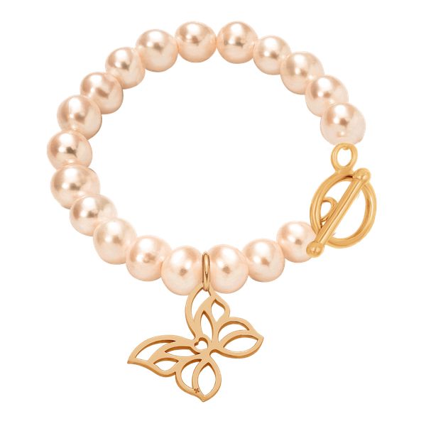 Bransoletka z pozłacanym ażurowym motylem o wielkości 1,5 cm i pozłacanym zapięciem w kształcie koła na dużych łososiowych perłach. Motyl jest symbolem wolności i beztroski. Elementy pokryte 18-karatowym złotem. Prosimy o podanie obwodu nadgarstka (w cm) w uwagach do zamówienia.