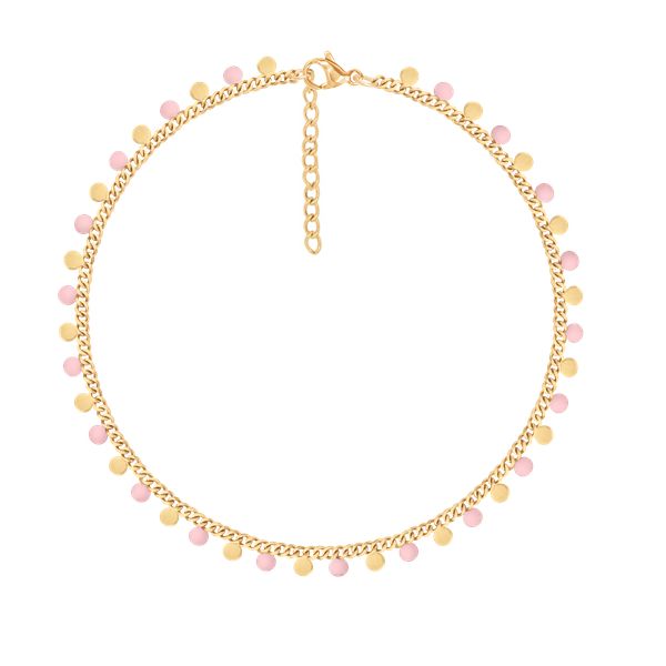 Bransoletka z blaszkami z różową emalią, pozłacana.Długość bransoletki: 16 cm + 5 cm przedłużkiBransoletka wykonana ze stali szlachetnej pokrytej 18-karatowym złotem, emaliowana.