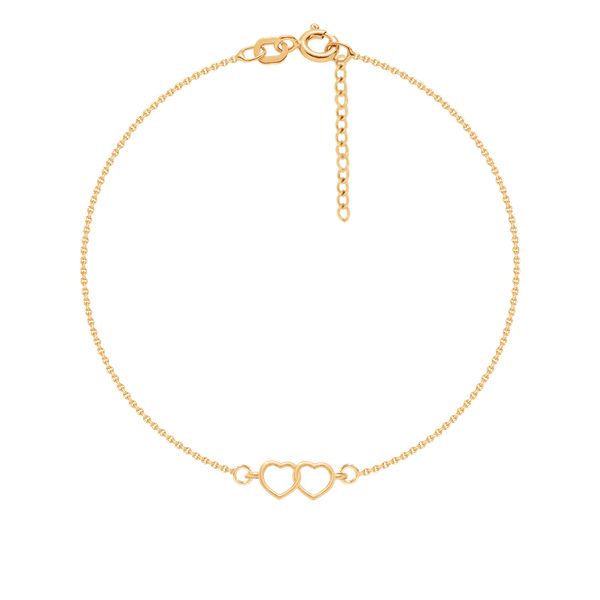 Bransoletka z pozłacanymi złączonymi sercami o wielkości 1 cm na łańcuszku. Złączone serca są symbolem trwałych uczuć. Obwód bransoletki: 16 cm Element pozłacany 18-karatowym złotem.