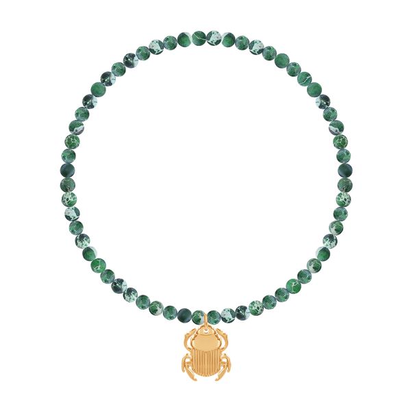 Bransoletka wykonana jest z jaspisu symbolizującego szczęście, radość oraz spokój. Skarabeusz to talizman szczęścia, odrodzenia oraz siły. Osobisty grawerunek uczyni Twoją biżuterię niepowtarzalną. Wielkość zawieszki: 1,5 cm Zawieszka wykonana jest ze stali szlachetnej pokrytej 18-karatowym złotem.