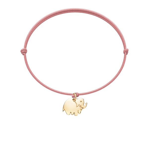 Bransoletka z pozłacanym słonikiem o wielkości 1 cm na cienkim różowym sznurku. Osobisty grawerunek doda wyjątkowości i pomoże wyrazić uczucia. Słonik jest symbolem szczęścia i siły. Zawieszka pozłacana 18-karatowym złotem.